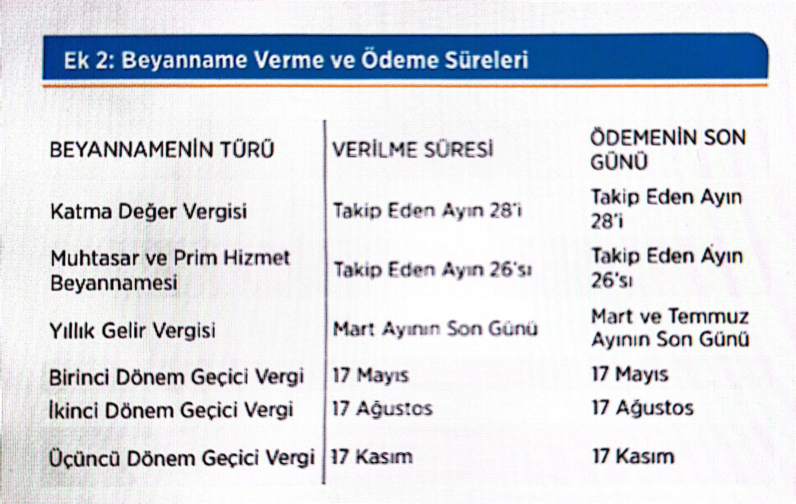 Geçici Vergi Beyannamesi : Geçici vergi, ticari kazanç sahipleri, serbest meslek sahibi ve kurumlar vergisi yükümlülerinin, cari vergilendirme döneminin gelir ve kurumlar vergisine, üç aylık kazançları üstünden hesaplanarak ödenen vergi uygulamasıdır. Geçici Vergi, Gelir Vergisi ve Kurumlar Vergisinin yılsonunu beklemeden, üç ayda bir elde edilen kazancın vergisinin önceden tahsil edilmesidir. Bu yüzden peşin vergi de denilmektedir. Serbest meslek kazanç defteri tutan mükelleflerin beyannamelerine serbest meslek kazancı bildirimi eklemeleri gerekir. Geçici Vergi beyannameleri, ilgili 3 aylık hesap döneminin bitimini takip eden 2.ayın 17. gününe kadar verilir ve ödenir. Örnek olarak Ocak-Şubat-Mart dönemine ait olan Geçici Vergi 17 Mayıs akşamına kadar verilir ve 17 Mayıs akşamına kadar ödenir.